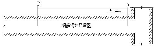 (2)预制顶板:在台阶以上C-D段部分,顶板钢筋锈蚀严重,部分地方钢筋锈蚀只剩5mm,混凝土保护层基本全部剥落,混凝土碳化深度20mm左右。台阶下部顶板混凝土碳化深度7-10mm。