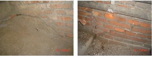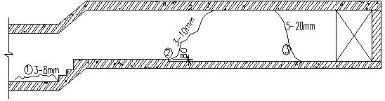 (1)两侧墙体裂缝:a、裂缝①在高低差处,下部第一步台阶位置,此处整体下降20mm左右,两边墙体裂缝宽度3-8mm。b、裂缝②在热力管道部位上部,高差大约80mm处,墙体两侧对称各有一条45°角方向的斜裂缝,缝宽3-10mm,下宽上窄,长度从顶板至底板。c、裂缝③在距井口大约4m处,墙体两侧对称部位各出现一条45°角方向的斜裂缝,缝宽5-20mm,上宽下窄,长度从顶板至底板。裂缝附近底板泥土有明显水流痕迹,底板也有明显修补痕迹。