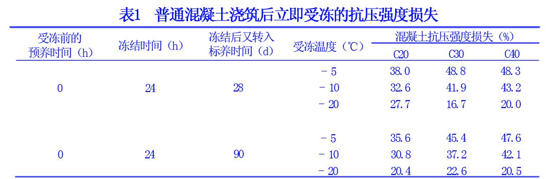 混凝土早期受冻以后,其抗压强度和抗拉强度都有一定损失,并且抗拉强度的损失要大于抗压强度的损失,表1为混凝土浇筑后立即受冻的抗压强度损失。
