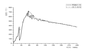 用FDS进行火灾模拟,既可方便地获得火灾空间不同时刻的温度分布,也可方便获取空间某点的火灾温度过程。通过切片提取,还可方便显示某平面或立面的温度分布及温度全过程。其中火灾荷载最大,热释放速率、平均温度和局部温度均较高的某位置处的温度过程如下图1 所示,通过分段线性处理得到拟合曲线(图中虚线所示),作为后续框架结构内部温度场分析相应构件环境升温曲线。