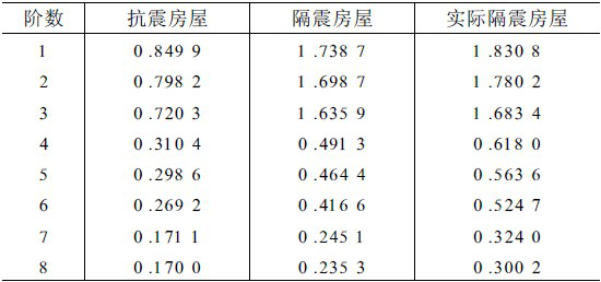 下面给出实际隔震房屋的结构动力特性及地震反应,并与实际抗震房屋进行比较。